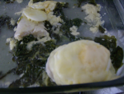 2. Num recipiente que possa ir ao forno, colocar os espinafres e por cima os medalhões de pescada (que podem estar ainda congelados).